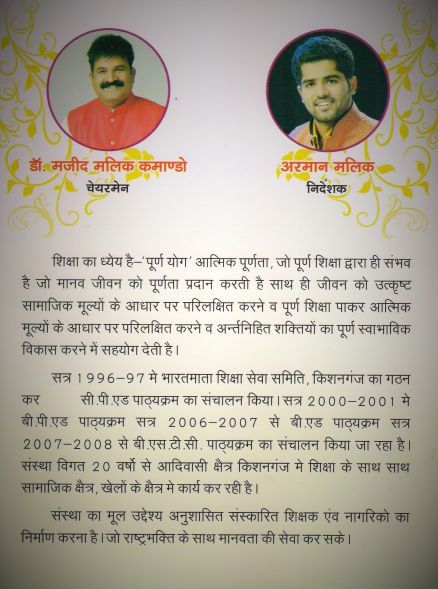 Contributions in the field of Education: The Teaching Method of Bharatmata Physical Teacher Training College, Kishangaj also various activities outside the classroom to inculcate professional and interpersonal skills. Some of these activities Educational Trip, S.U.P.W. Camp, Industrial Visit etc. We gave students health and yoga classes specially.